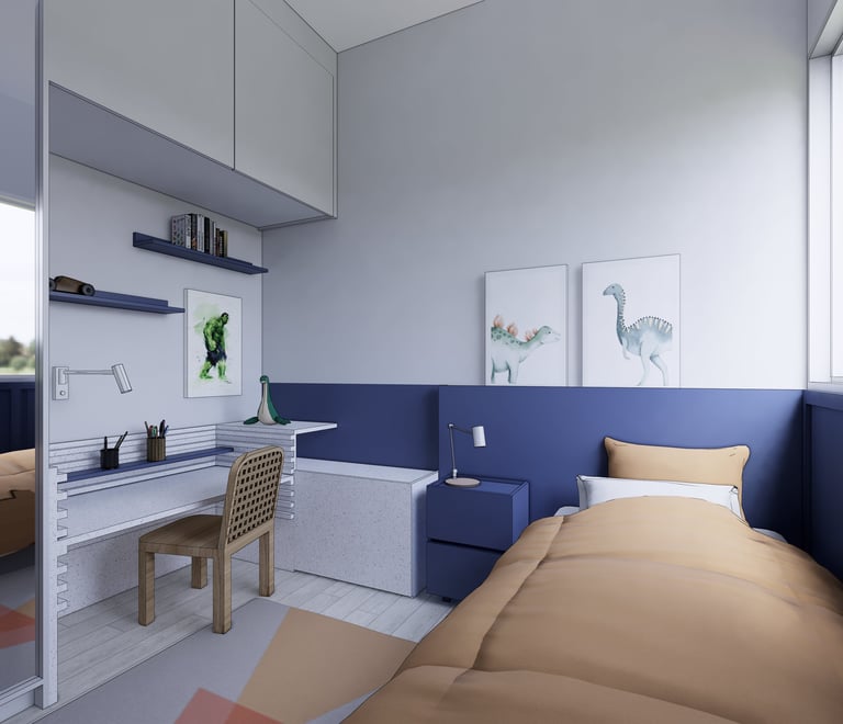 Projeto de quarto infantil atemporal, o destaque fica para mesa de estudo que é regulável e se adapta ao crescimento da criança. Trouxemos cores, elementos e personagens para combinar com a personalidade do pequeno dono do quarto.
